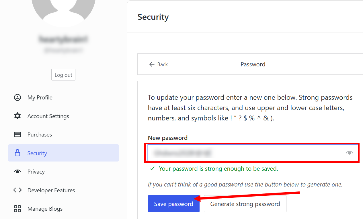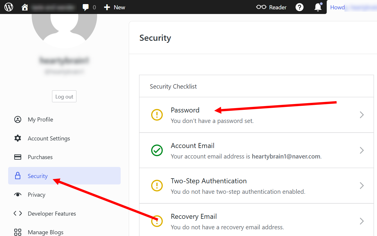 워드프레스(WordPress.com)의 security 페이지에서 비밀번호를 설정합니다.