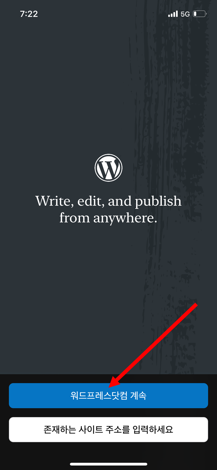 워드프레스 모바일 어플을 다운로드 및 설치하고 실행합니다.