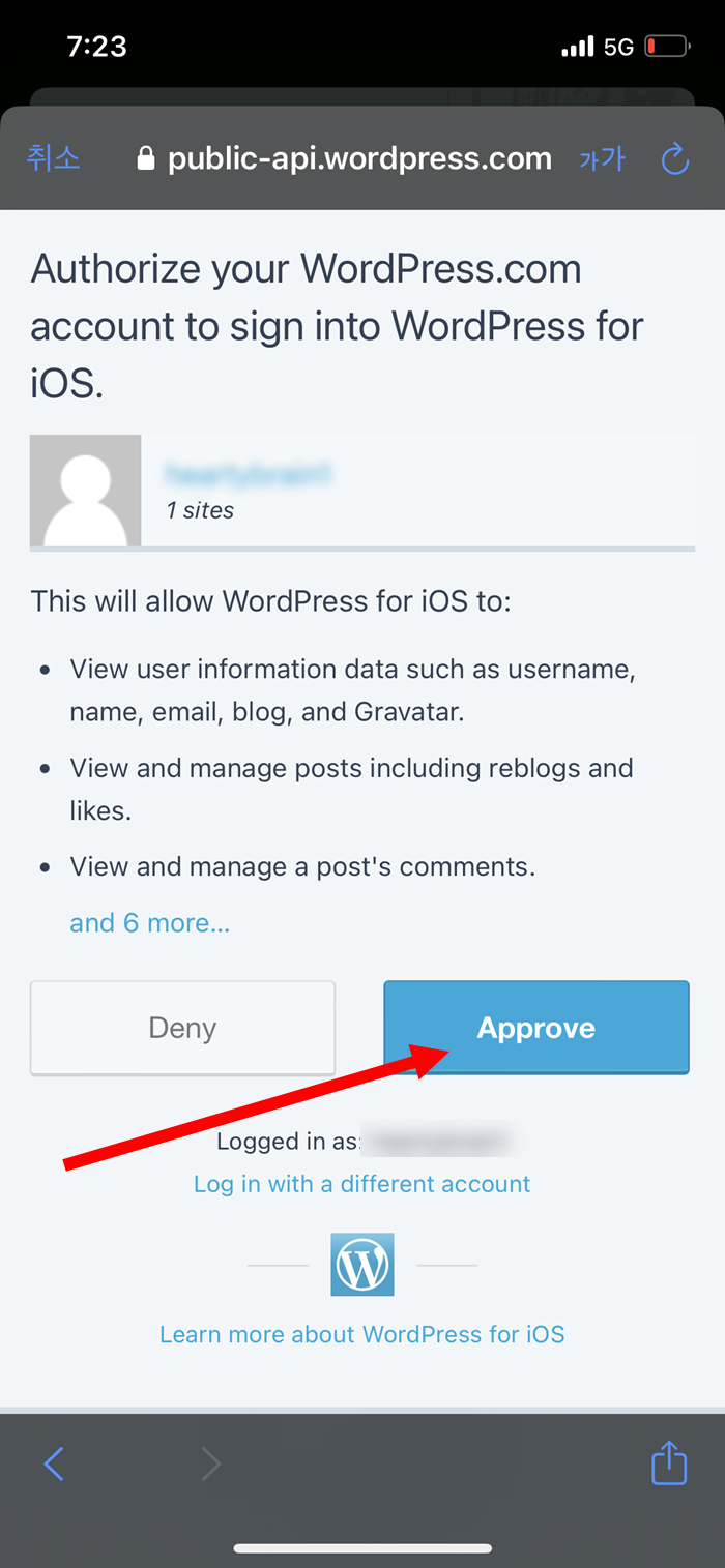 모바일 장치에서 워드프레스 계정 로그인을 승인합니다(approve)