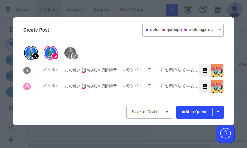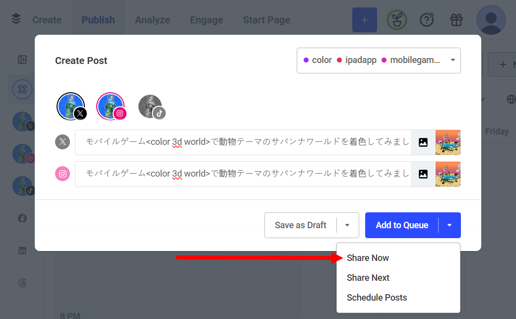 7)add to queue를 선택하면 해당 게시글을 대기열에 추가합니다 큐(queue)는 각 요일별로 정해놓은(예를들어 월~금 10:00, 14:00, 18:00) 자동 발행 시간표로 이 옵션을 선택하면 시간표에 따라 다음 빈칸에 자동 배치됩니다.