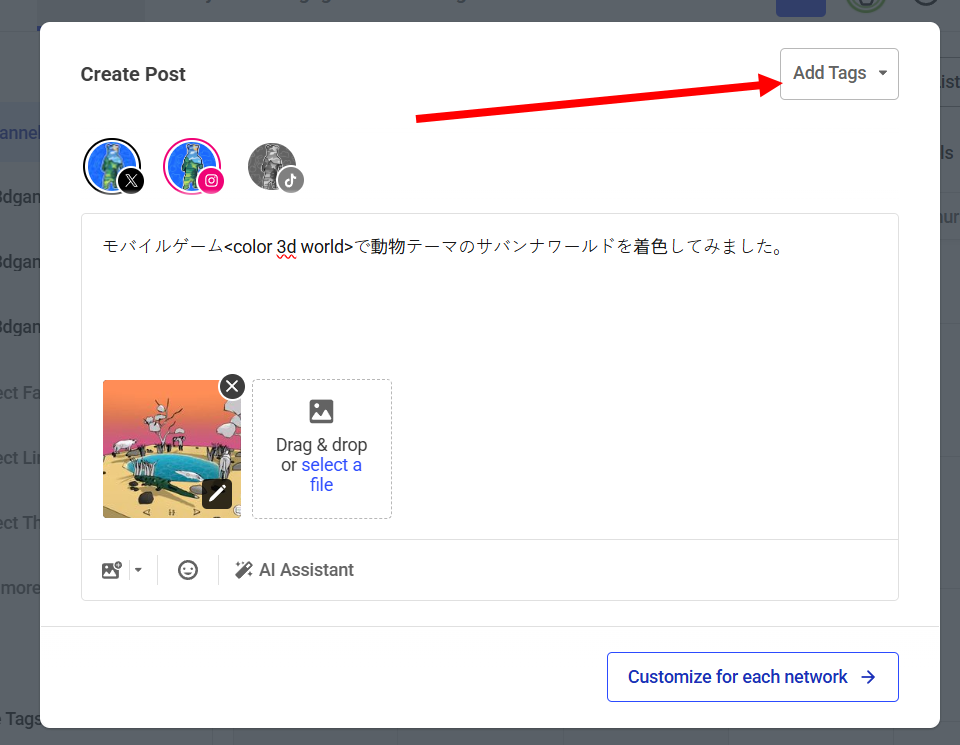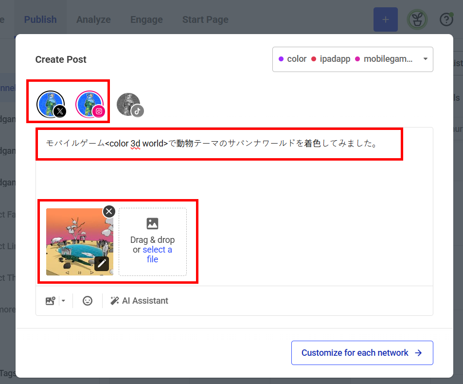 4)작성한 게시글 및 태그를 확인하고 customize for each network를 선택합니다.