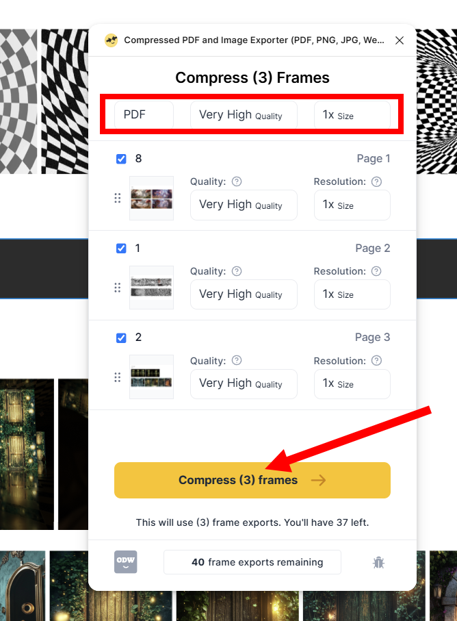 10)PDF 및 옵션을 선택하고 compress frames를 클릭합니다.
