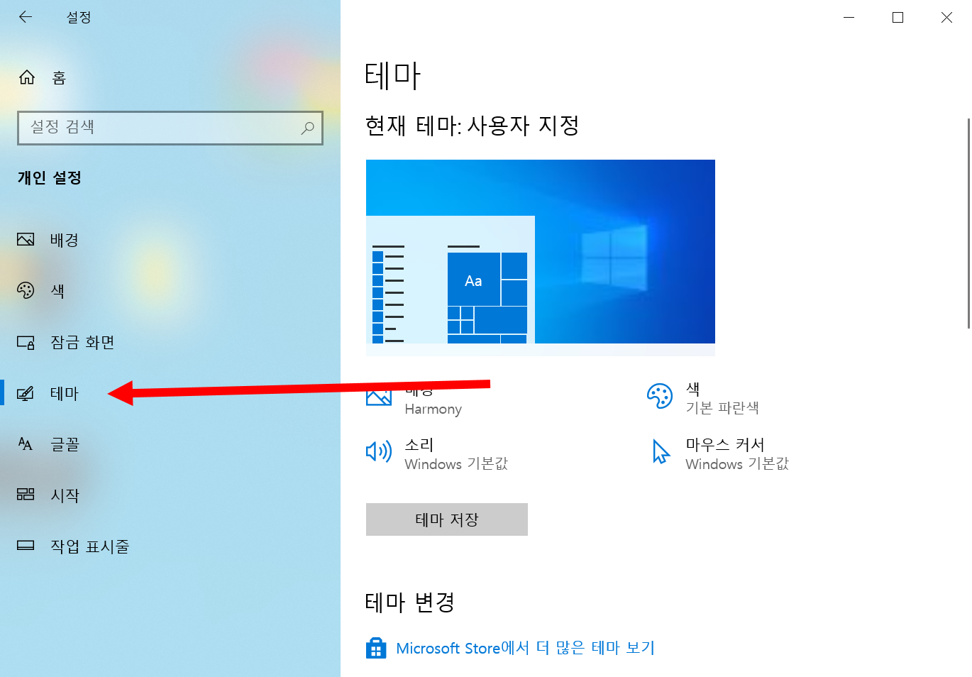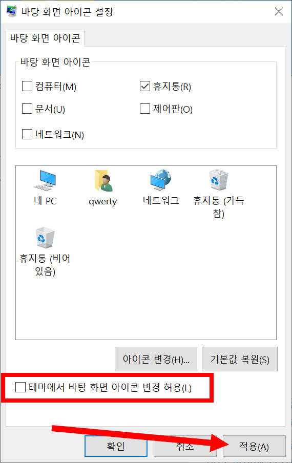 5)테마에서 바탕 화면 아이콘 변경 허용 옵션을 체크해제하고 적용합니다.