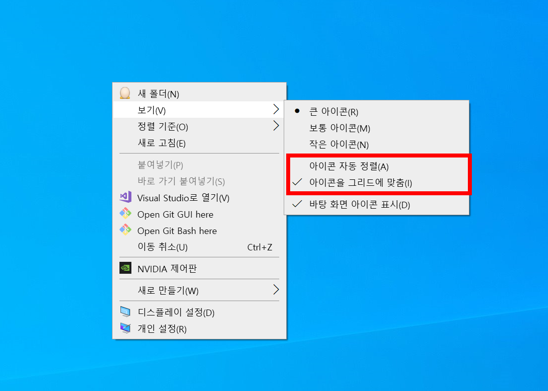 1)바탕화면 마우스 우클릭 메뉴에서 보기의 아이콘을 그리드에 맞춤 옵션을 확인합니다