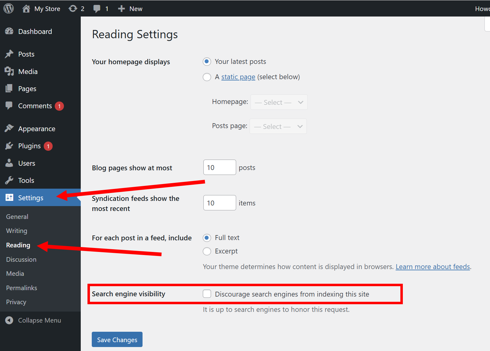 3)search engine visibility에 체크하고 변경사항을 저장합니다(save changes)