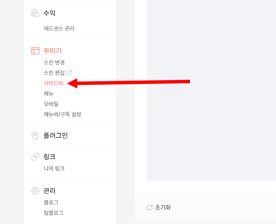 6)좌측의 꾸미기 메뉴에서 사이드바로 이동합니다.