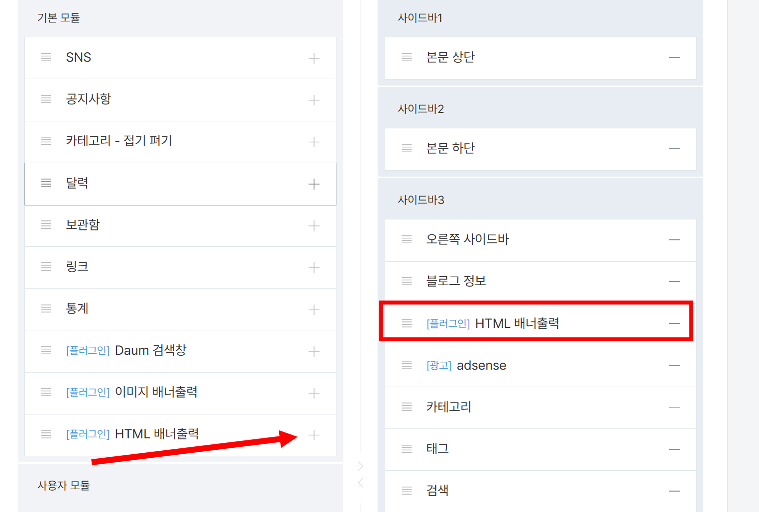 7)HTML 배너출력 플러그인을 추가하고 사이드바를 선택 및 위치를 설정합니다.