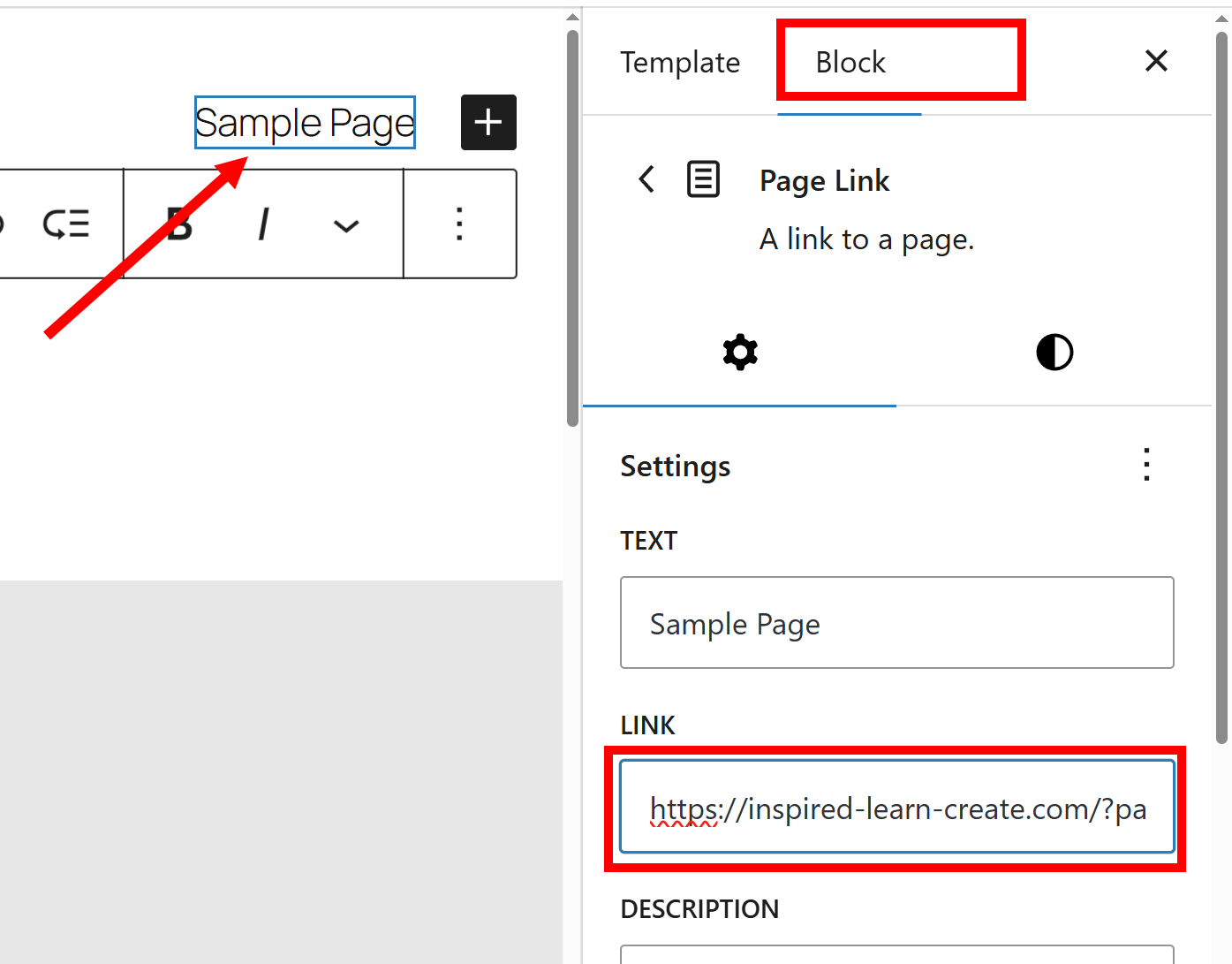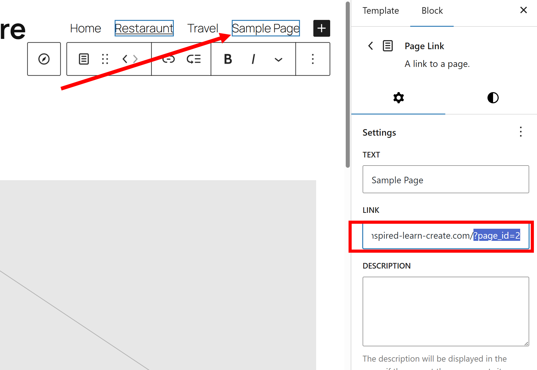 27)블록 편집기의 네비게이션 메뉴에서 해당 페이지 링크를 선택하고 링크 주소를 확인합니다(LINK)