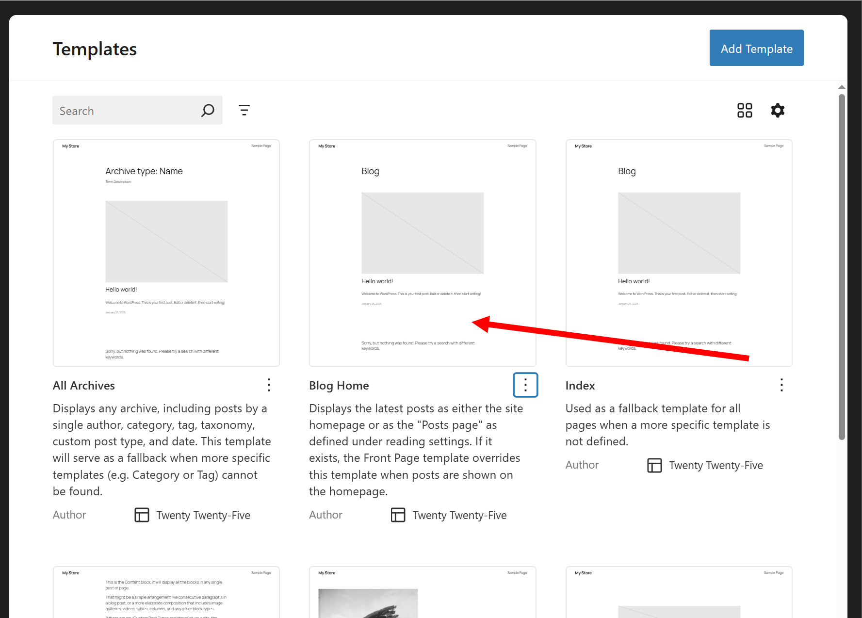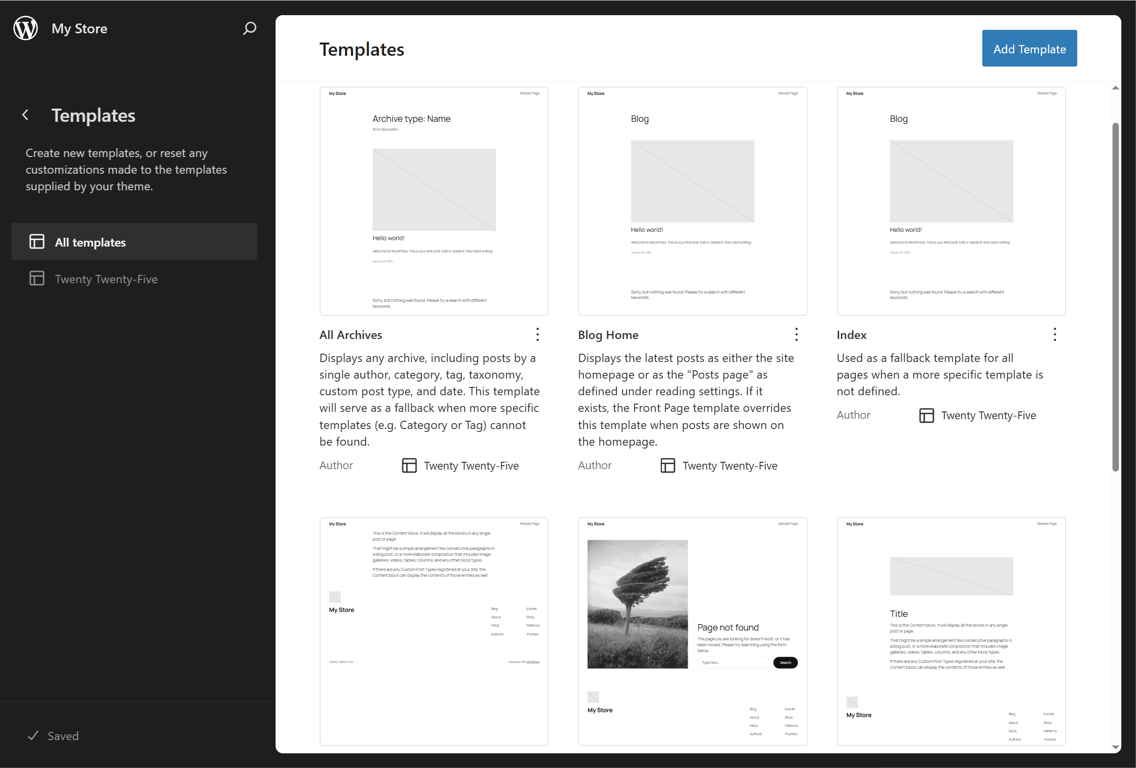 5)Templates(템플릿)는 사이트의 페이지 유형(글, 페이지, 아카이브, 404 오류 페이지 등)이 어떻게 표시될지 정의하는 디자인 레이아웃 구조입니다.