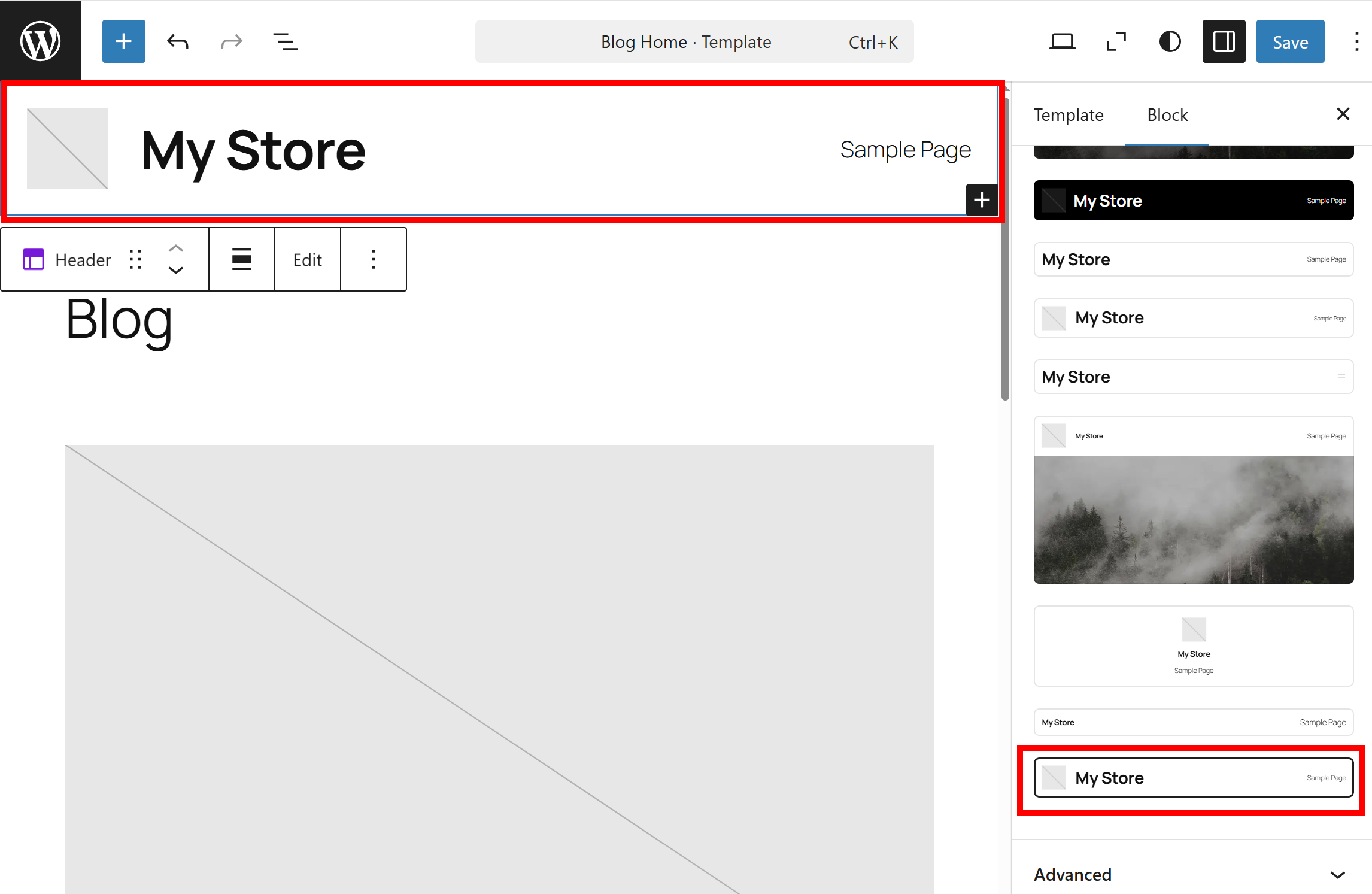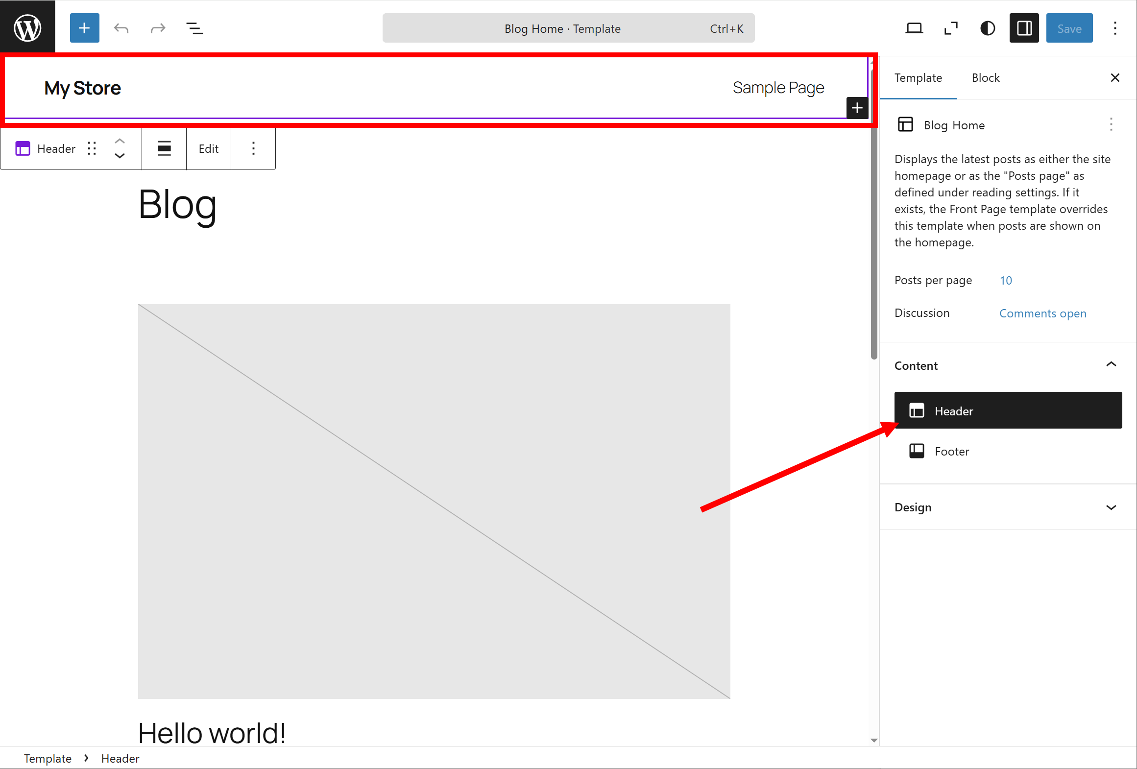 9)Content의 Header를 선택하면 Blog Home 템플릿의 헤더(사전구성된)를 선택합니다. 헤더(header)는 일반적으로 사이트 상단 영역에서 사이트 제목, 로고, 메뉴, 검색, 로그인 버튼 등을 포함합니다.