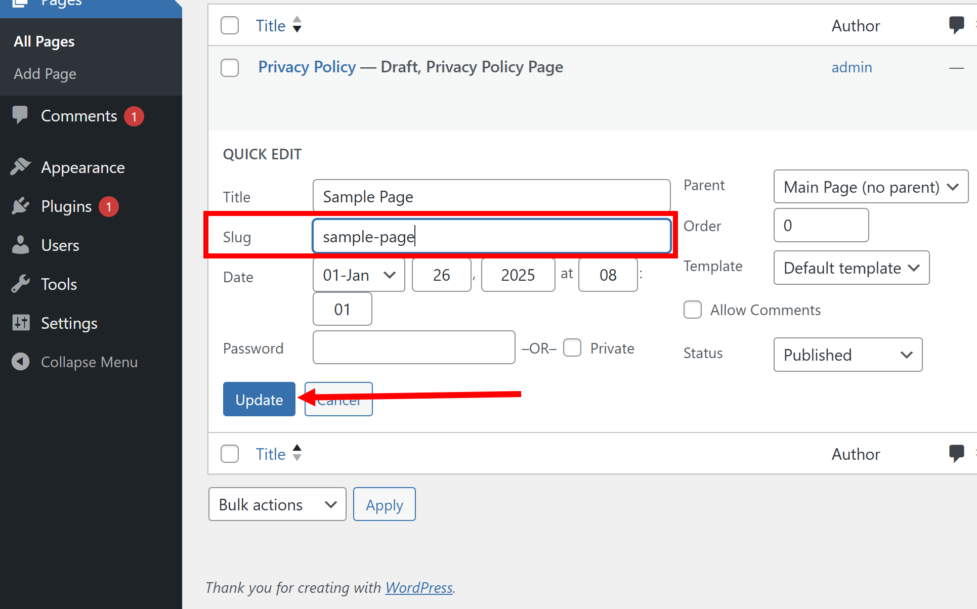 26)Slug에 페이지 링크에 사용할 문자열을 입력하고 업데이트합니다(update)