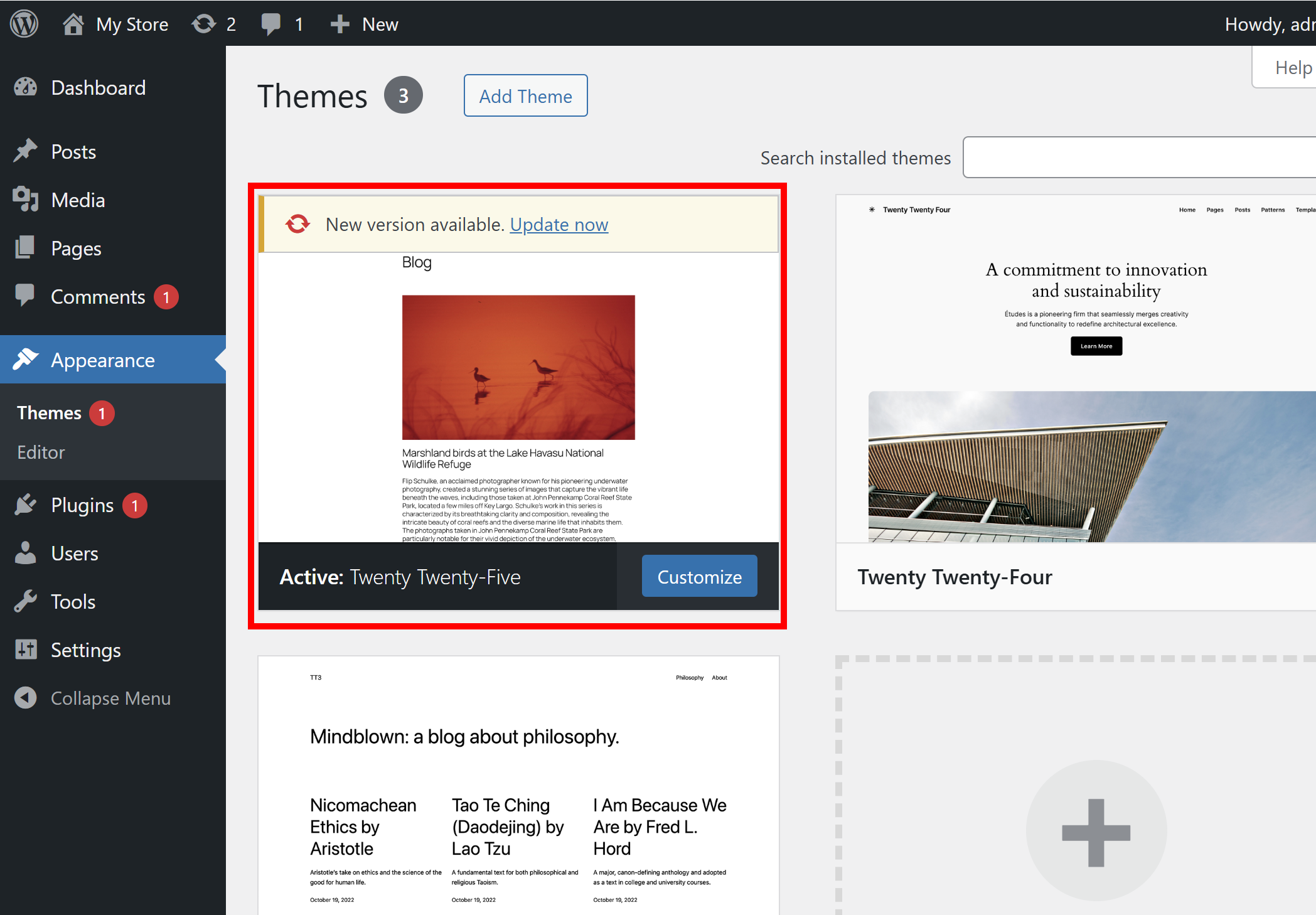 1)워드프레스 관리자 페이지 좌측 appearance 메뉴의 theme에서 현재 활성화 및 사용중인 테마를 확인할수있습니다.