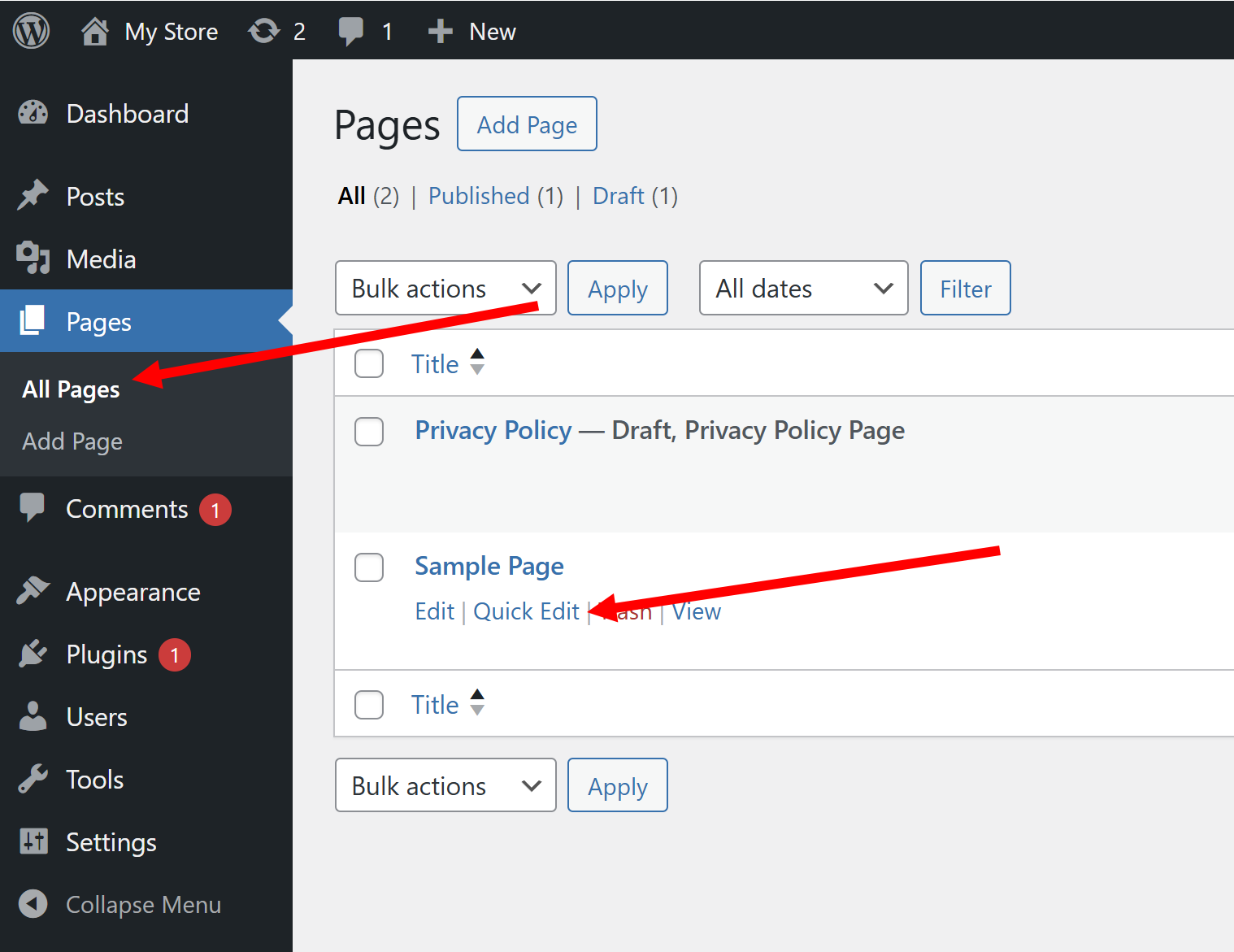 25)관리자페이지 좌측의 pages 메뉴에서 all pages로 이동합니다. 링크 주소를 설정하련는 페이지의 quick edit로 이동합니다.