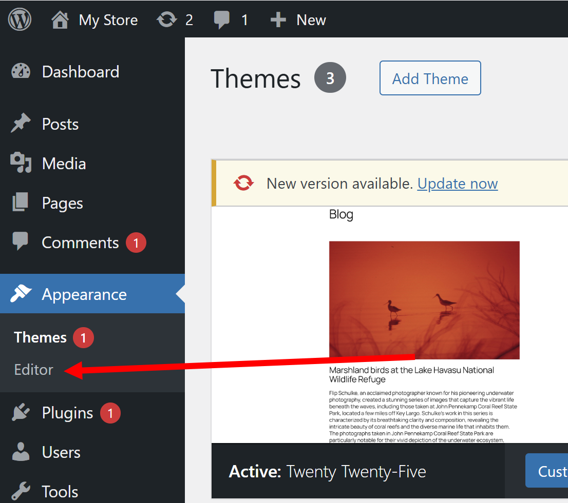 2)웹사이트를 편집 및 구성하려면 appearance 메뉴의 editor로 이동합니다.
