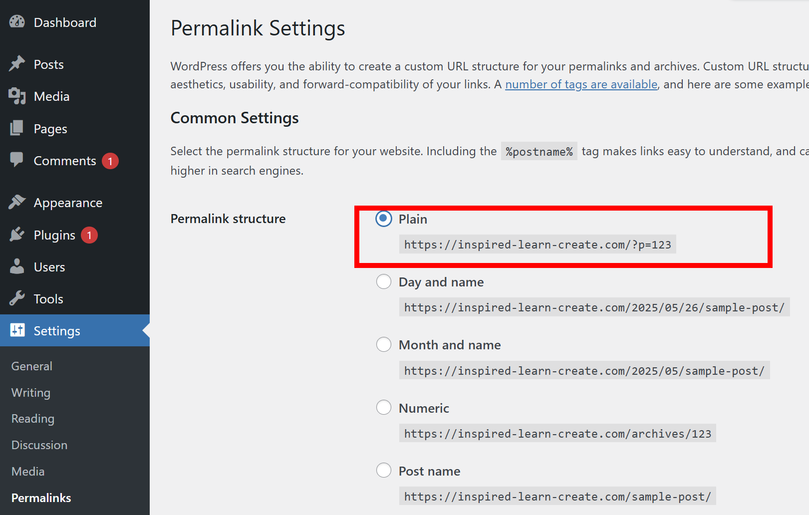 31)permalink structure에서 Plain으로 기본설정되어있는것을 확인할수있습니다.