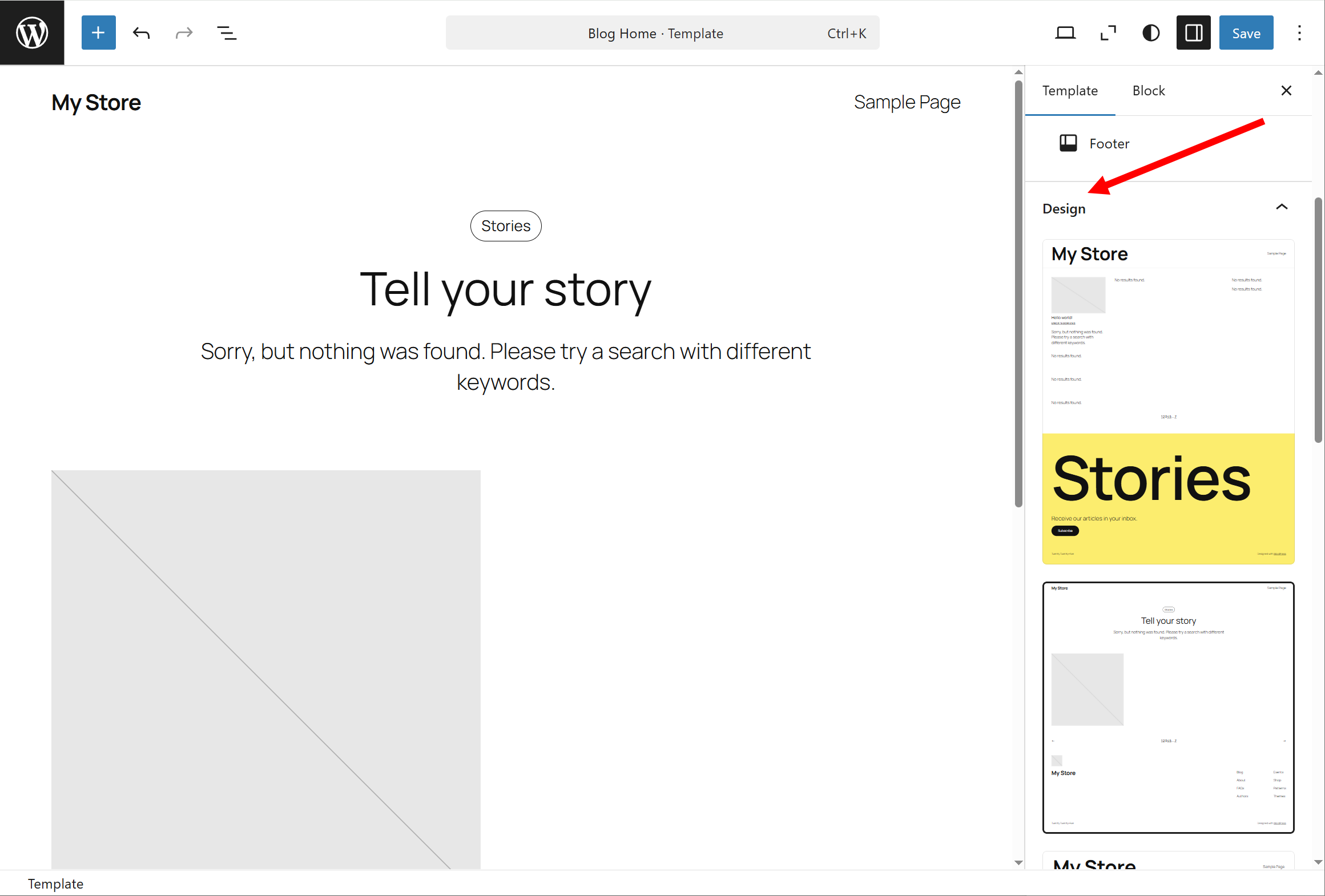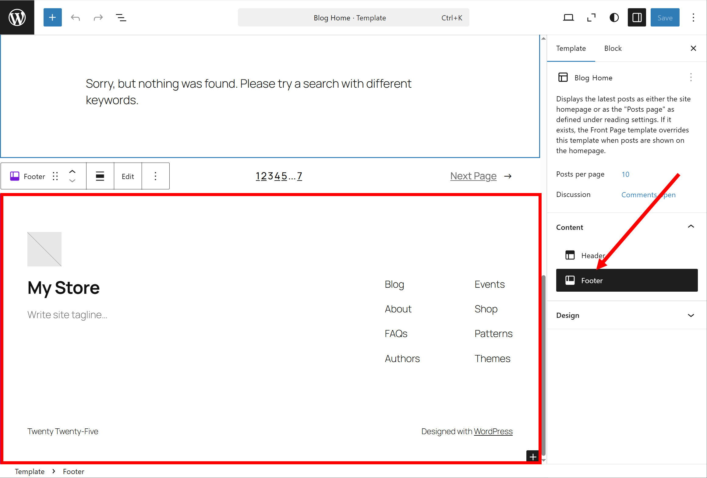10)Content의 Footer를 선택하면 Blog Home 템플릿에서 푸터(사전 구성된)를 선택합니다. 푸터(footer)는 사이트 하단 영역에서 저작권, 연락처, 하단 메뉴, 소셜 링크, 푸터 위젯 등을 포함합니다.