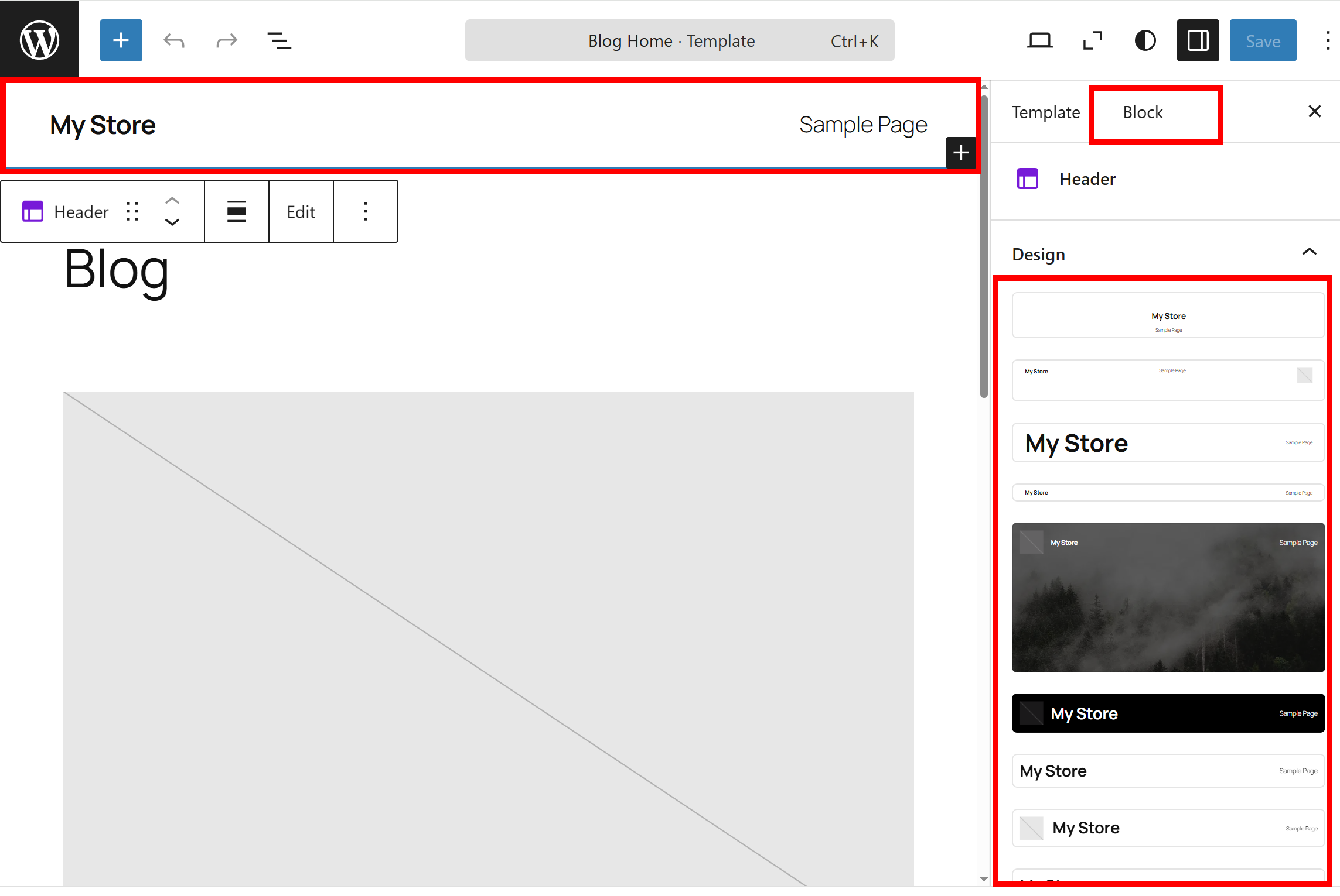 11)상단의 헤더 및 블록(Block)을 선택합니다. 해당 블록에 적용할수있는 사전 설정된 디자인을 확인할수있습니다.