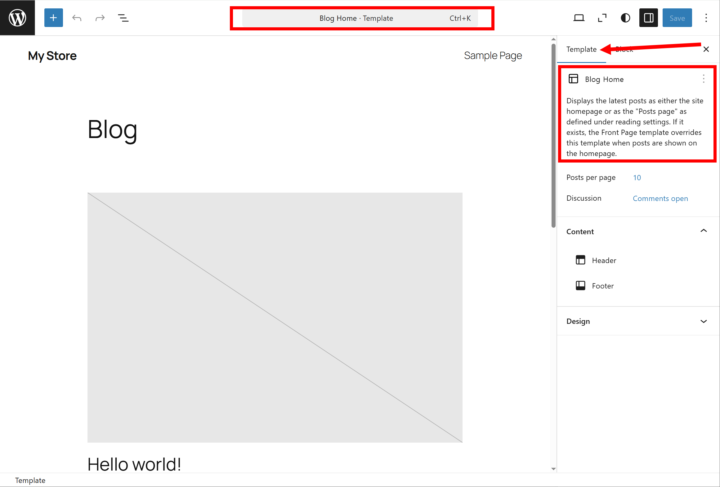 7)페이지 상단 또는 우측 상단에서 현재 편집중인 템플릿이 사전정의된 Blog Home Template인것을 확인할수있습니다.