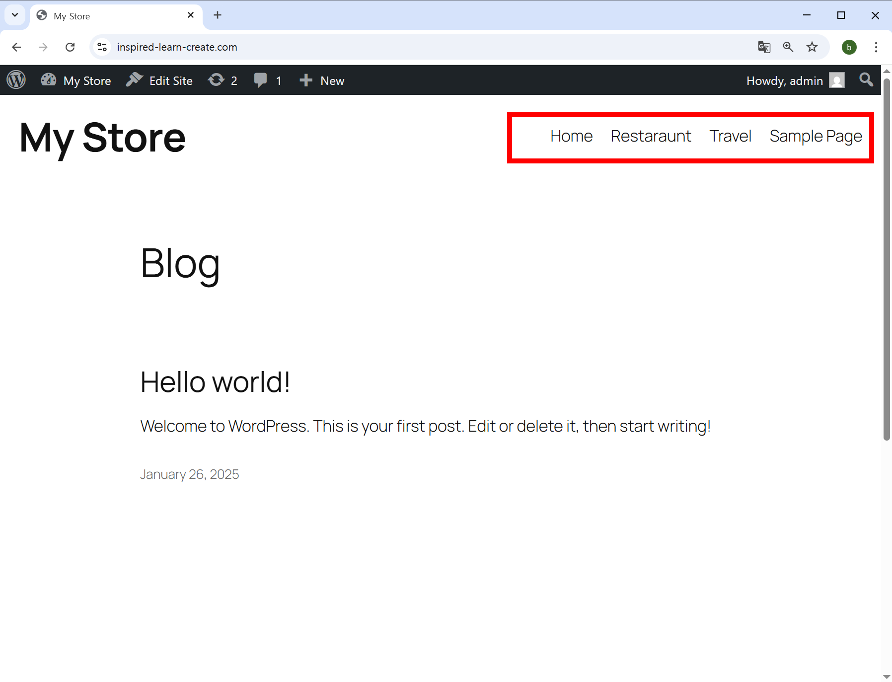 24)블록 편집기에서 편집한 내용을 저장하면(save) 추가 구성한 메뉴를 표시하며 해당 사이트를 열기했을때 정상적으로 표시되는것을 확인할수있습니다.