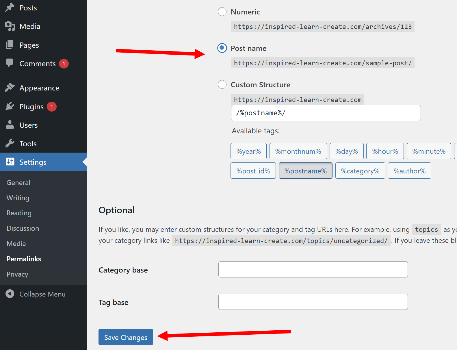 32)post name으로 변경하고 저장합니다(save changes)