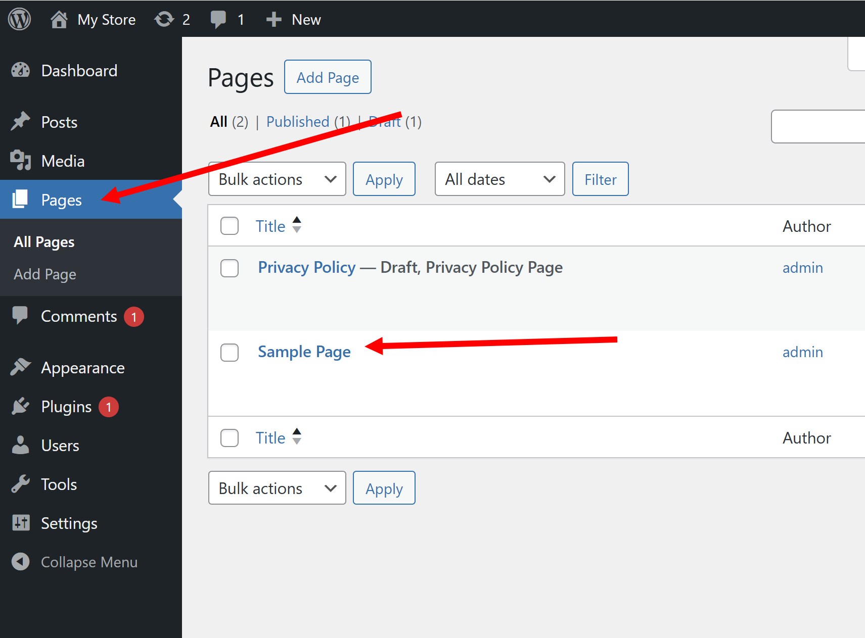 18)사이트에서 현재 공개된 페이지 목록을 확인하려면 워드프레스 관리자 페이지의 pages 메뉴로 이동합니다.