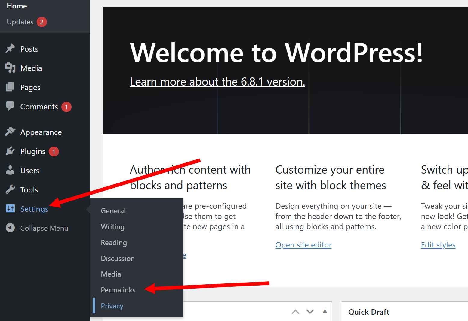 30)워드프레스 관리자 페이지 좌측 Settings 메뉴에서 Permalinks로 이동합니다.