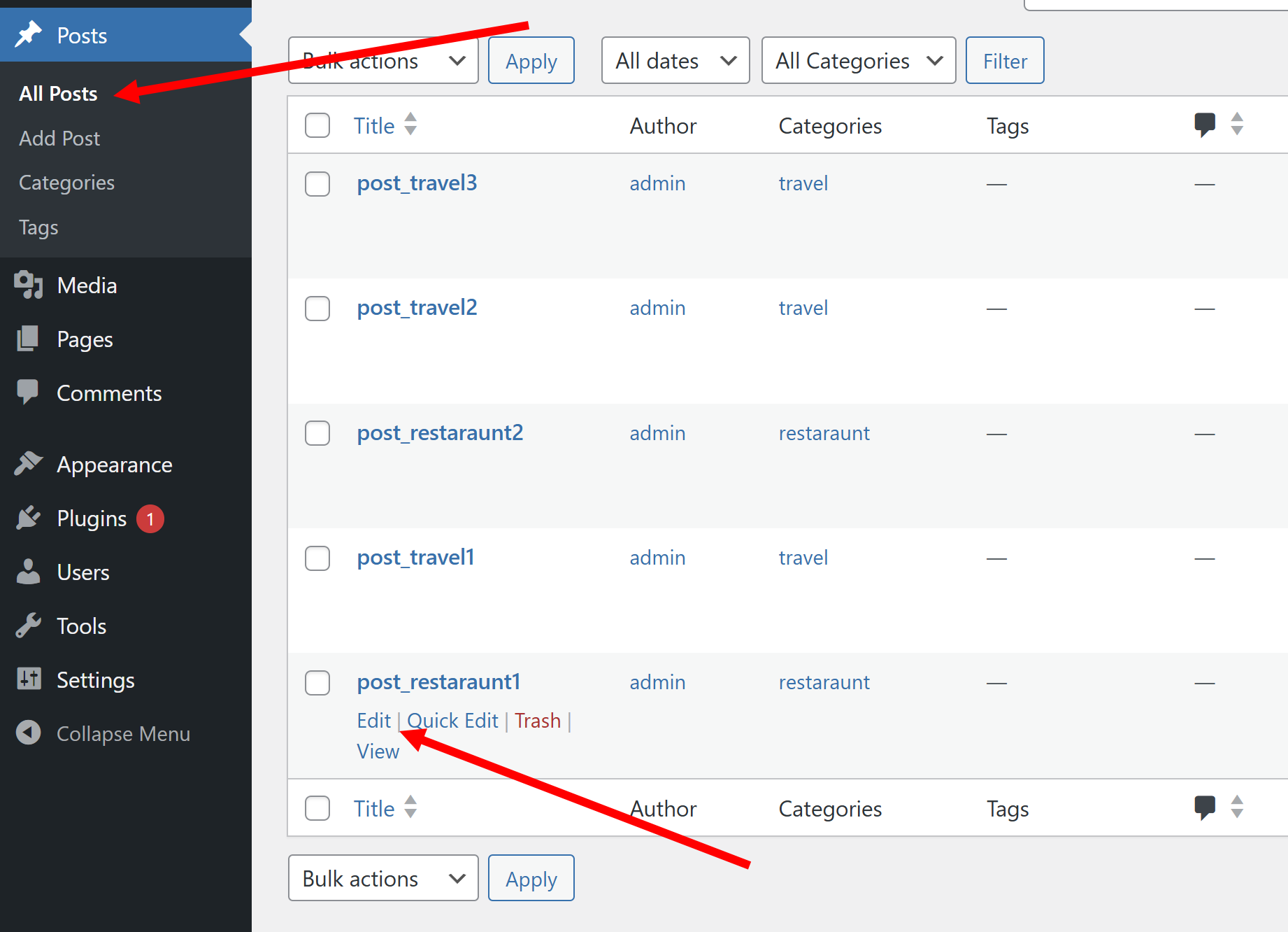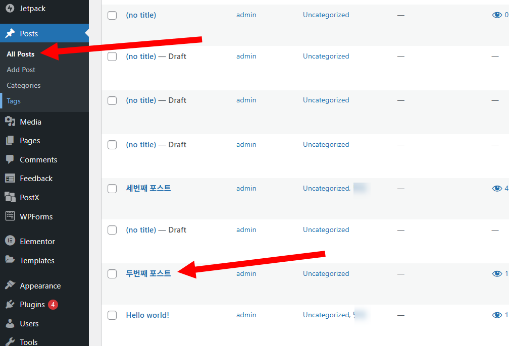 10)대시보드 Posts 메뉴의 All Posts에서 대표 이미지를 설정할 게시물의 편집으로 이동합니다.