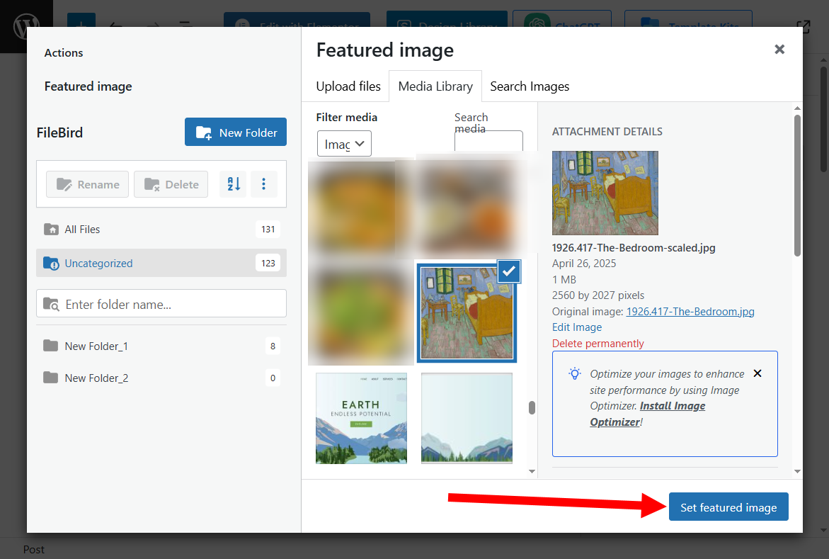 13)라이브러리에서 이미지를 선택 및 set featured image를 클릭합니다.