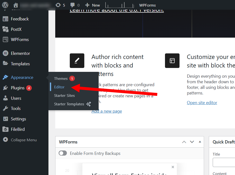 1)워드프레스 대시보드에서 appearance의 editor로 이동합니다.