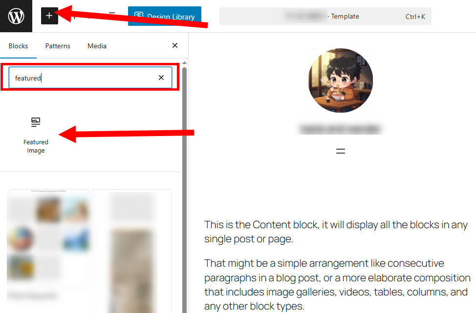 6)대표 이미지 블록을 추가하려면 좌측 상단 블록 추가에서 featured image를 검색 및 추가합니다.