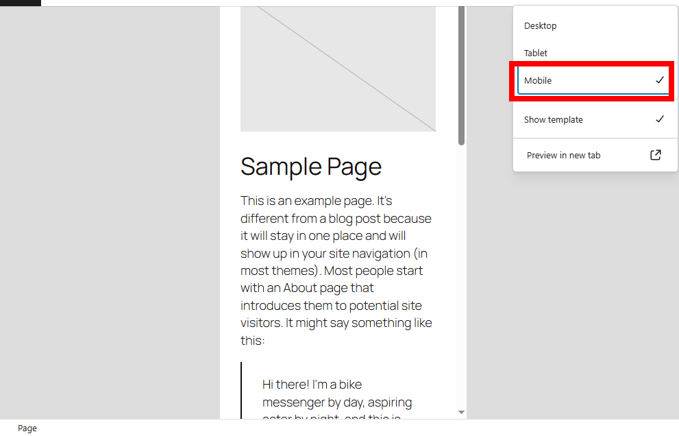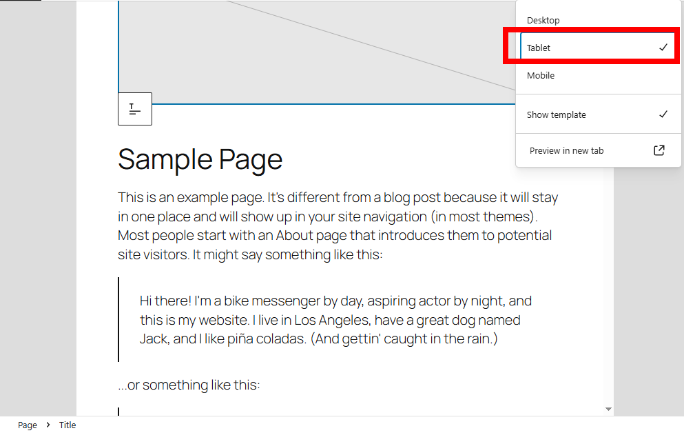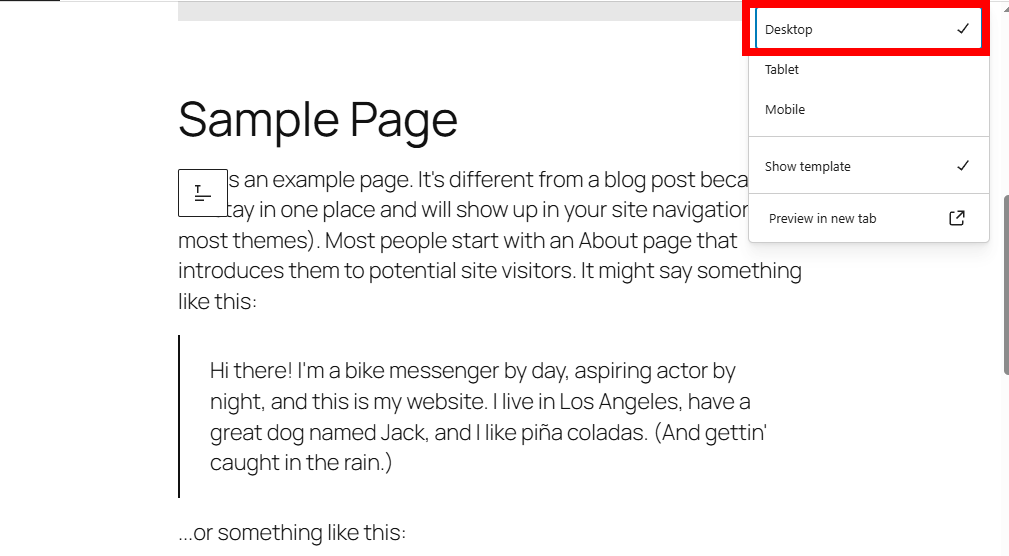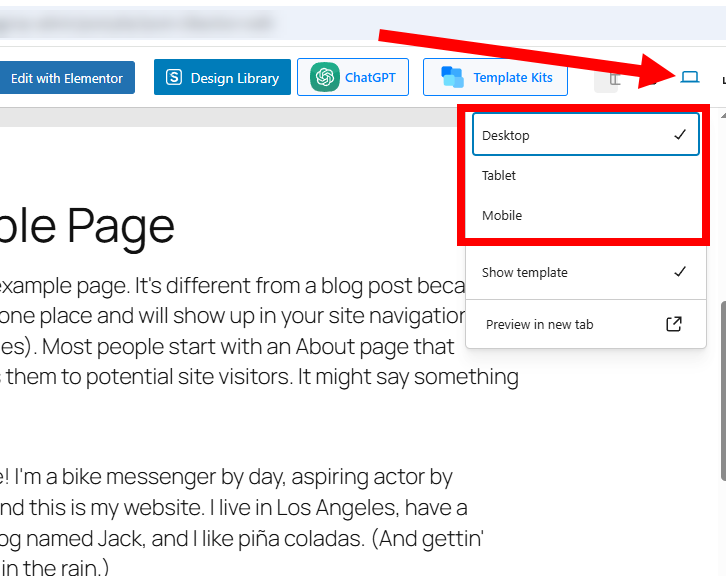 2)포스트 및 페이지 편집의 상단에서 보기 옵션을 확인합니다(데스크톱, 태블릿, 모바일)