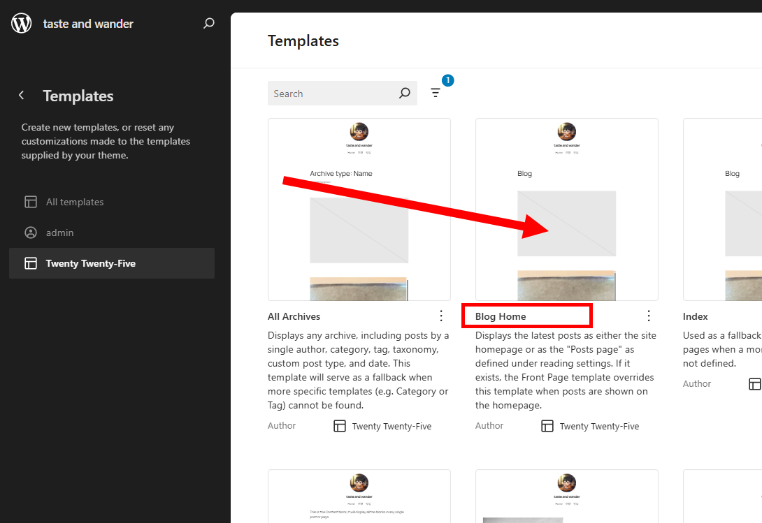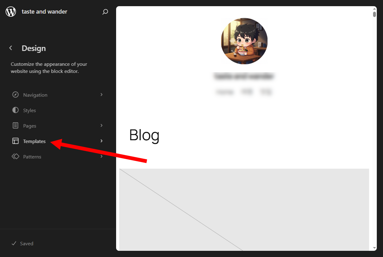 2)사이트 블록 편집기에서 템플릿(Templates)으로 이동합니다.