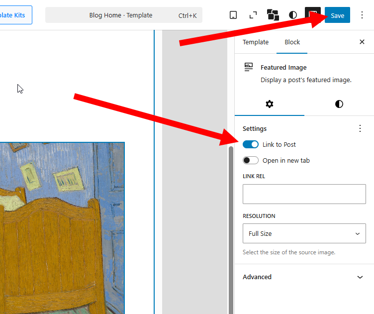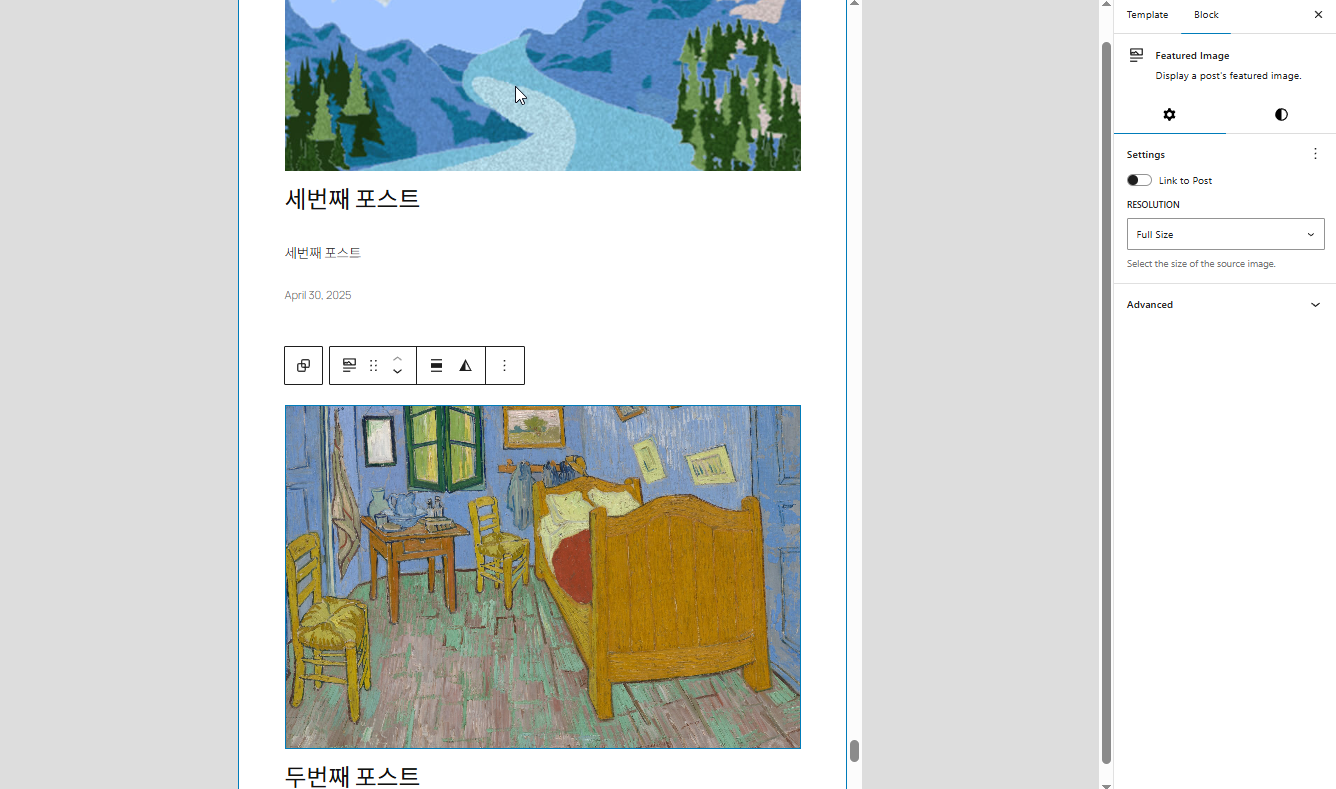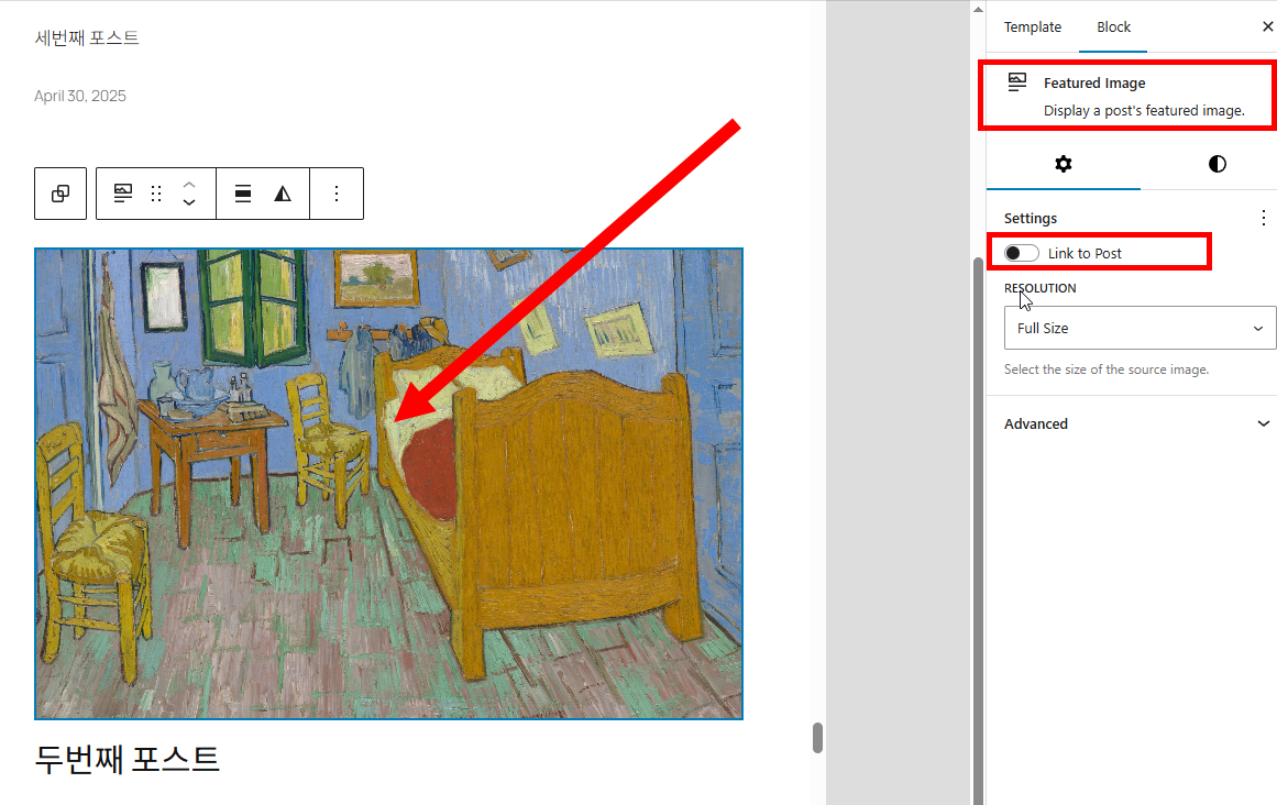 5)대표 이미지(Featured Image) 블록을 선택합니다. settings에서 Link to Post가 비활성화되어있는것을 확인할수있습니다. 이 옵션이 비활성화되있으면 대표 이미지를 클릭해도 해당 게시물로 연결되지않습니다.