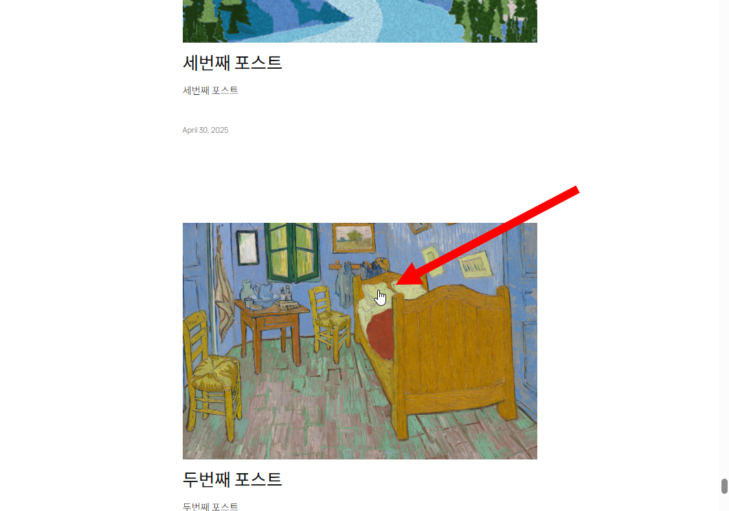7)사이트의 대표이미지 위에서 마우스 커서 모양이 바뀌는것을 확인할수있으며 이미지를 클릭하면 해당 게시물로 이동합니다.