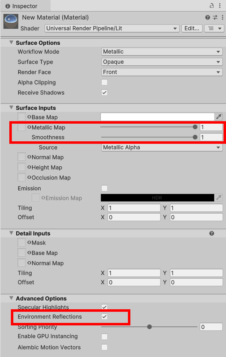 2)새로운 재질(URP/Lit)을 생성하고 반사도 높은 금속 표면으로 설정합니다. environment reflections 속성에 체크되어있는지 확인합니다.