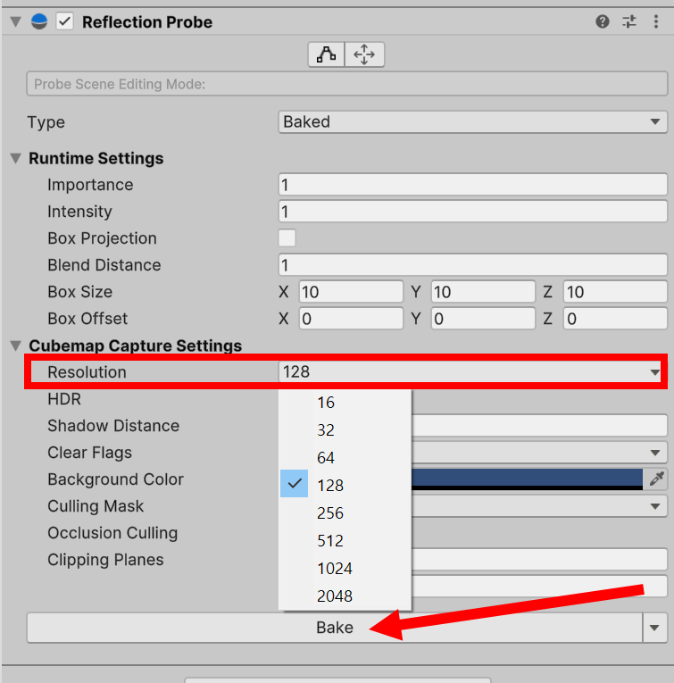 18)리플렉션 프로브(reflection probe)의 cubemap capture settings에서 해상도를 재설정하고 bake를 클릭합니다.