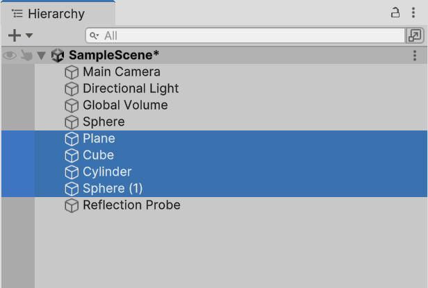 9)씬에서 주변 환경 반사에 포함시킬 오브젝트를 선택합니다. 이 오브젝트는 리플렉션 프로브의 캡처 대상에 포함됩니다.