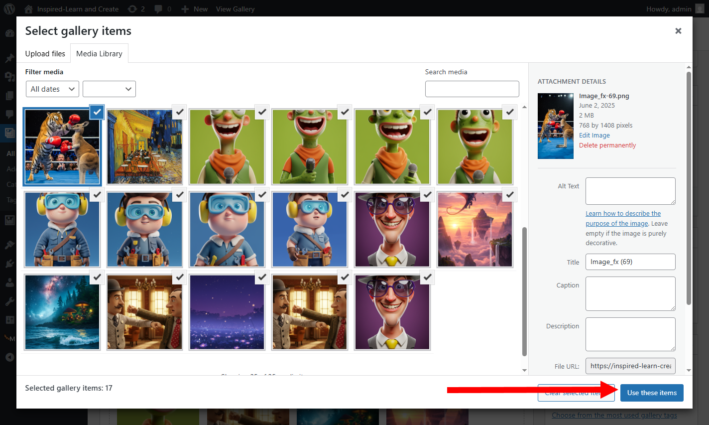 6)미디어 라이브러리에서 갤러리에 추가할 모든 이미지를 선택하고 use these items를 클릭합니다.