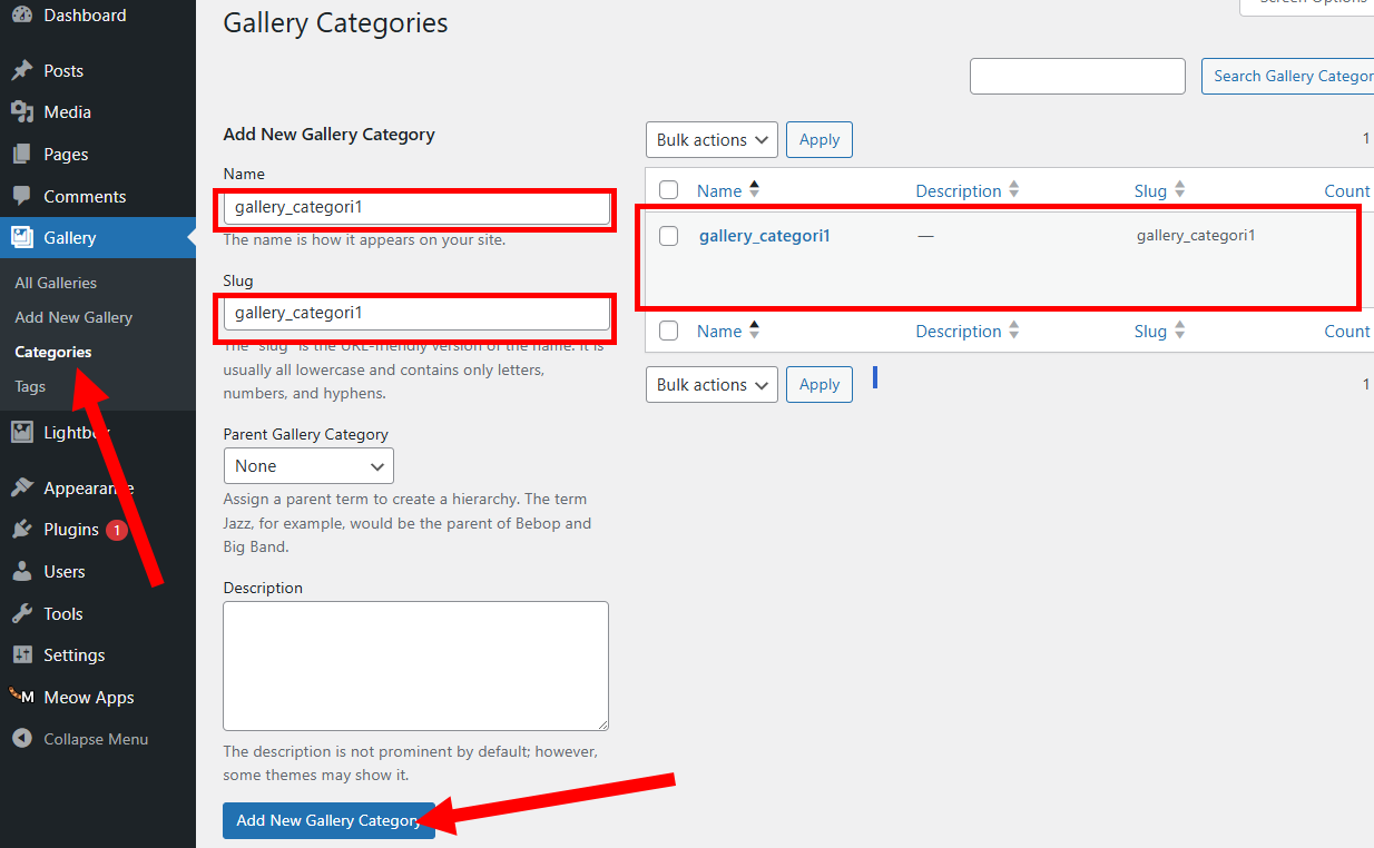 3)갤러리(gallery)의 categories 메뉴에서 새로운 갤러리 카테고리를 추가합니다(add new gallery category)