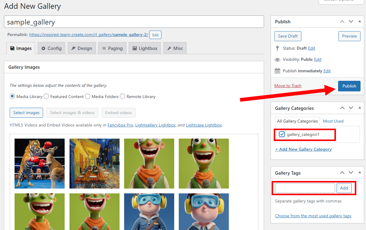 7)갤러리 카테고리(gallery categories)와 태그(tags)를 설정하고 publish를 클릭하여 갤러리를 추가합니다.