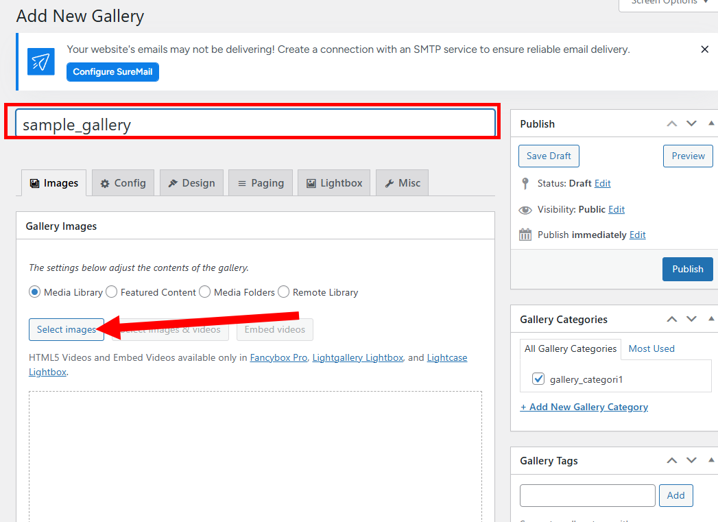 5)갤러리 이름을 설정하고 gallery images에서 media library의 select images를 선택합니다.