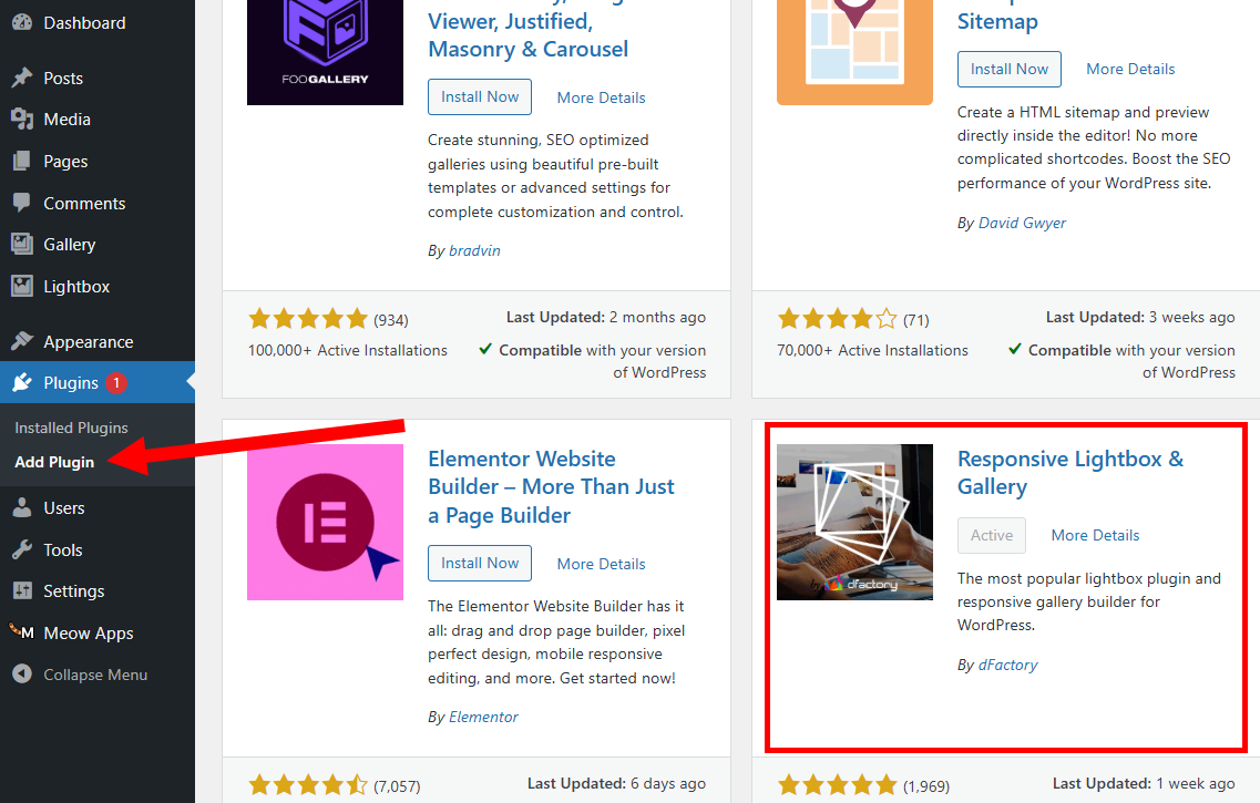 1)워드프레스 add plugin에서 Responsive Lightbox & Gallery 플러그인을 검색하고 설치 및 활성화합니다(install now, activate)