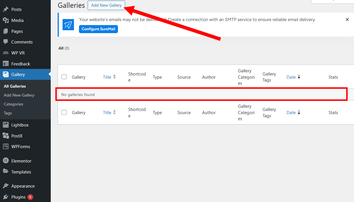 4)갤러리 메뉴에서 현재 갤러리가 존재하지않는것을 확인할수있습니다. 새로운 갤러리를 추가하려면 상단의 add new gallery로 이동합니다.