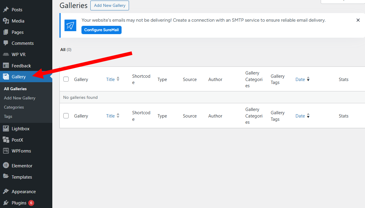 4)갤러리 메뉴에서 현재 갤러리가 존재하지않는것을 확인할수있습니다. 새로운 갤러리를 추가하려면 상단의 add new gallery로 이동합니다.