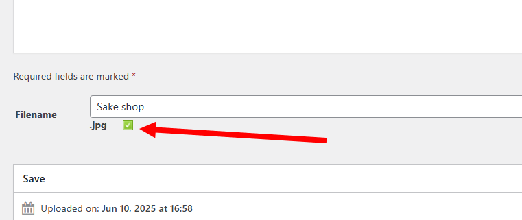 6)플러그인이 정상적으로 설치되었으면 미디어 편집 하단에 filename 입력란을 표시합니다. 변경할 파일이름을 입력하고 업데이트합니다(update)