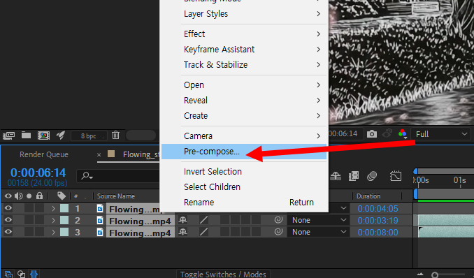 1)에프터이펙트에서 동영상을 가져오기합니다.