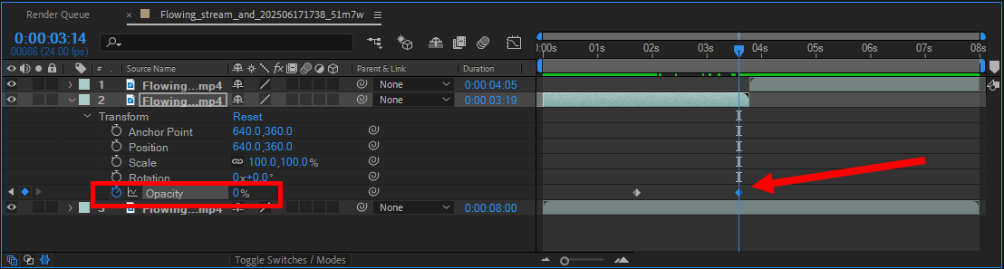 첫번째 레이어 푸티지 불투명도 0에서 100으로 페이드 인 키프레임 설정