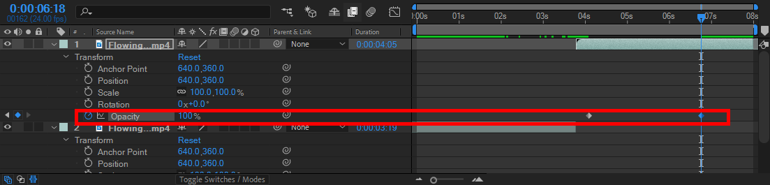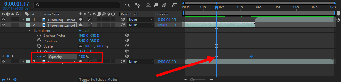 두번째 레이어 푸티지 불투명도 100 에서 0으로 페이드 아웃 키프레임 설정