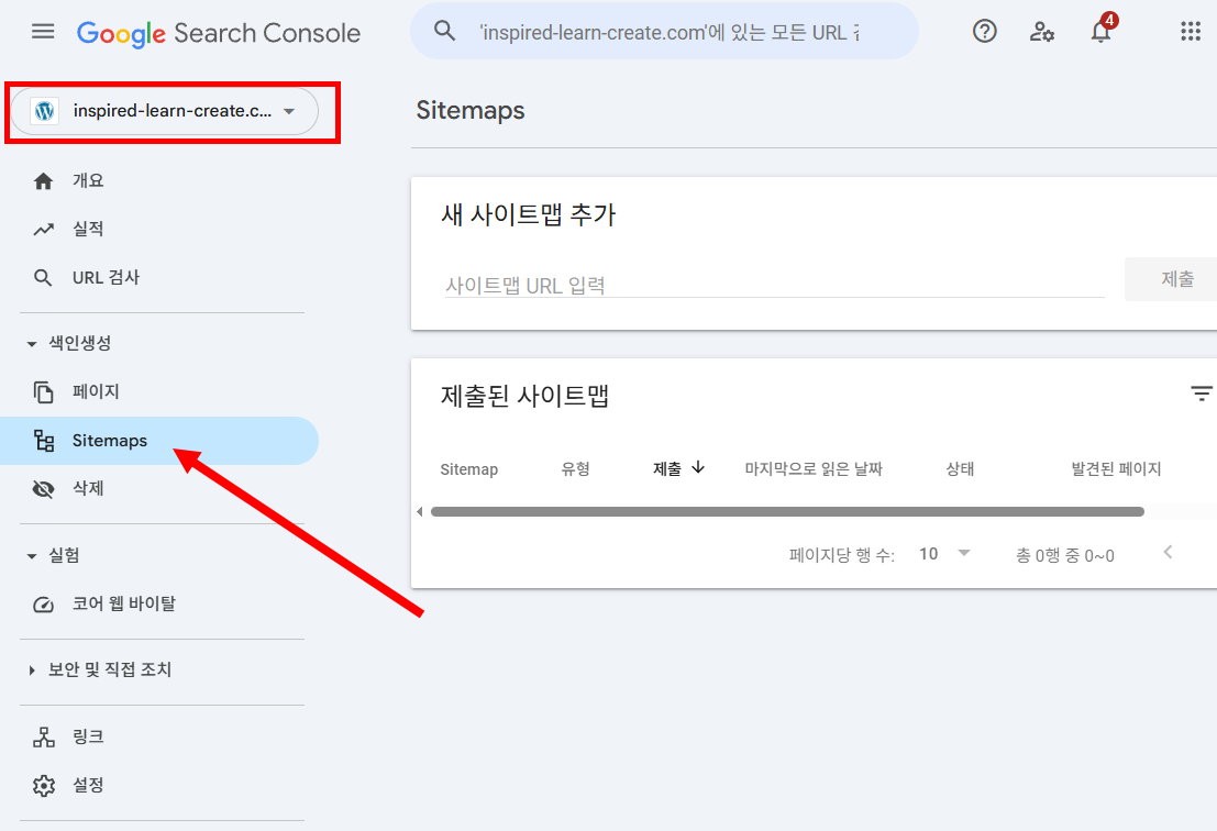 1)구글 서치 콘솔 홈페이지에서 사이트를 선택하고 sitemaps 메뉴로 이동합니다.