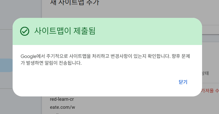 4)구글 서치 콘솔 새 사이트맵 추가에서 사이트맵 주소를 입력 및 제출합니다.